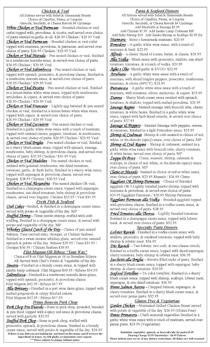 Pan seared veal medallions, finished in a garlic white wine sauce with a touch of marinara, topped with sautéed onions, peppers, tomatoes, & mushrooms, served over choice of pasta.