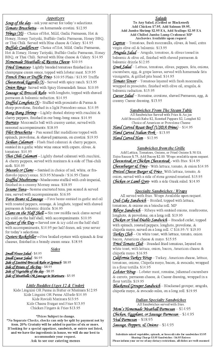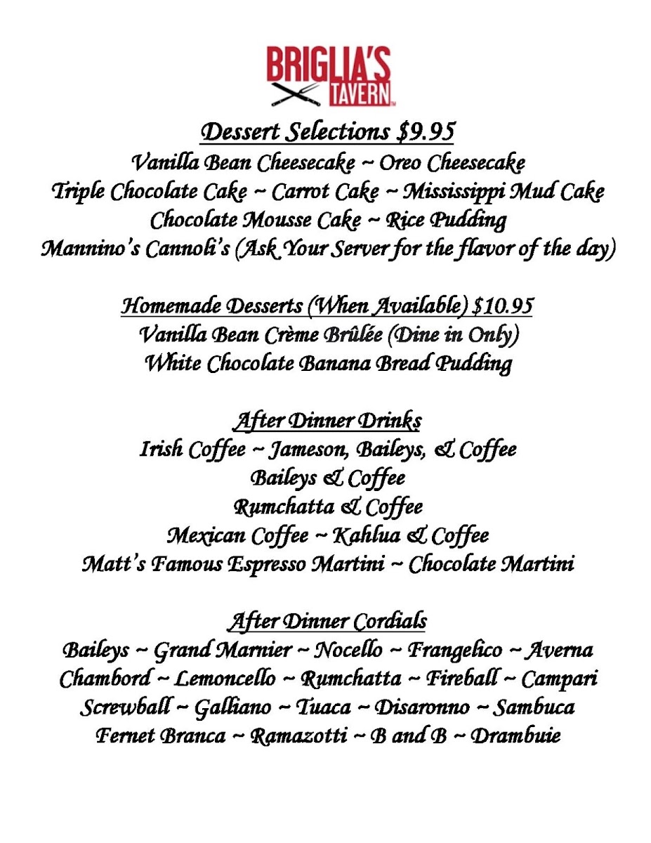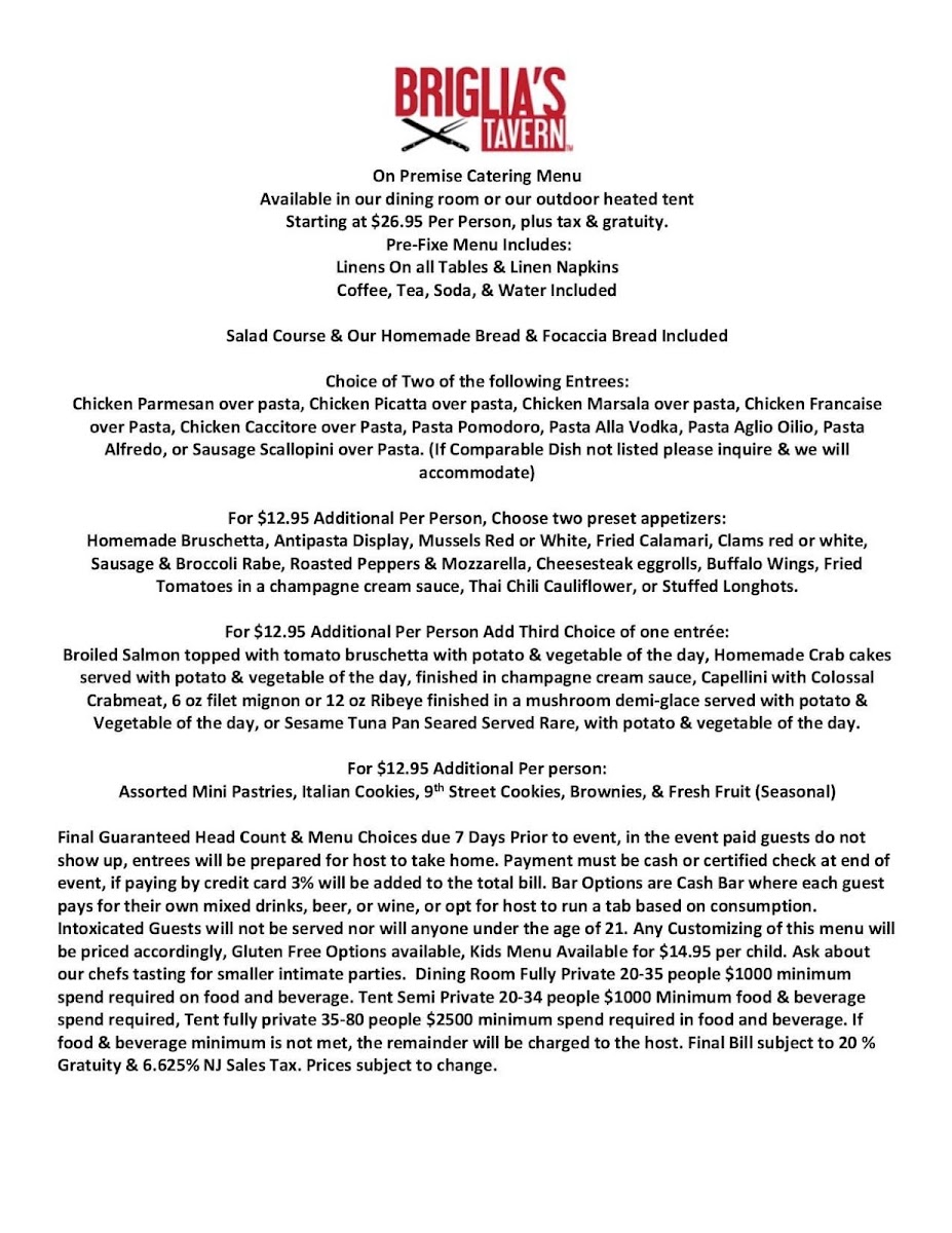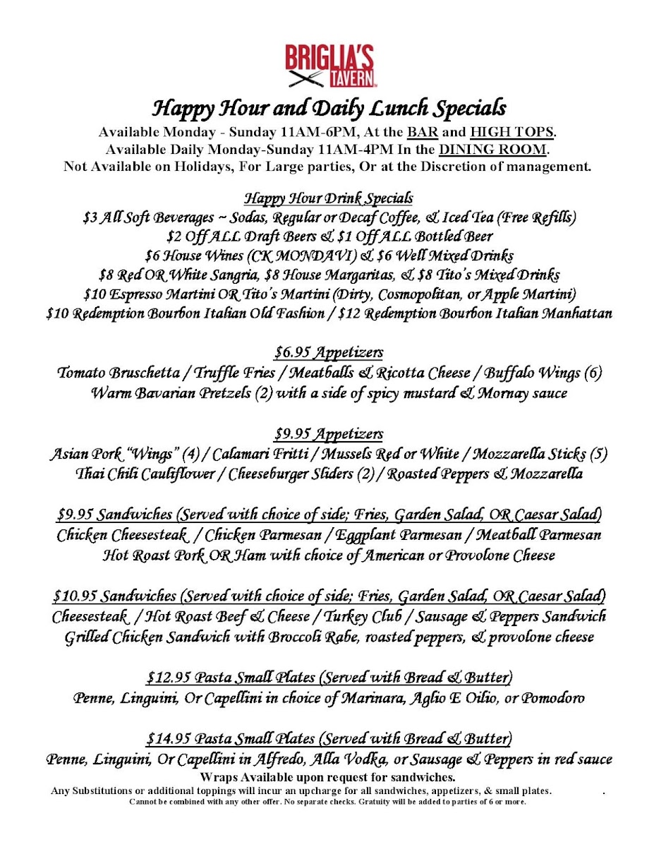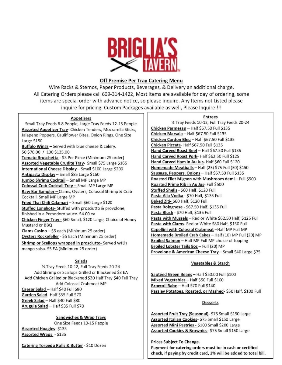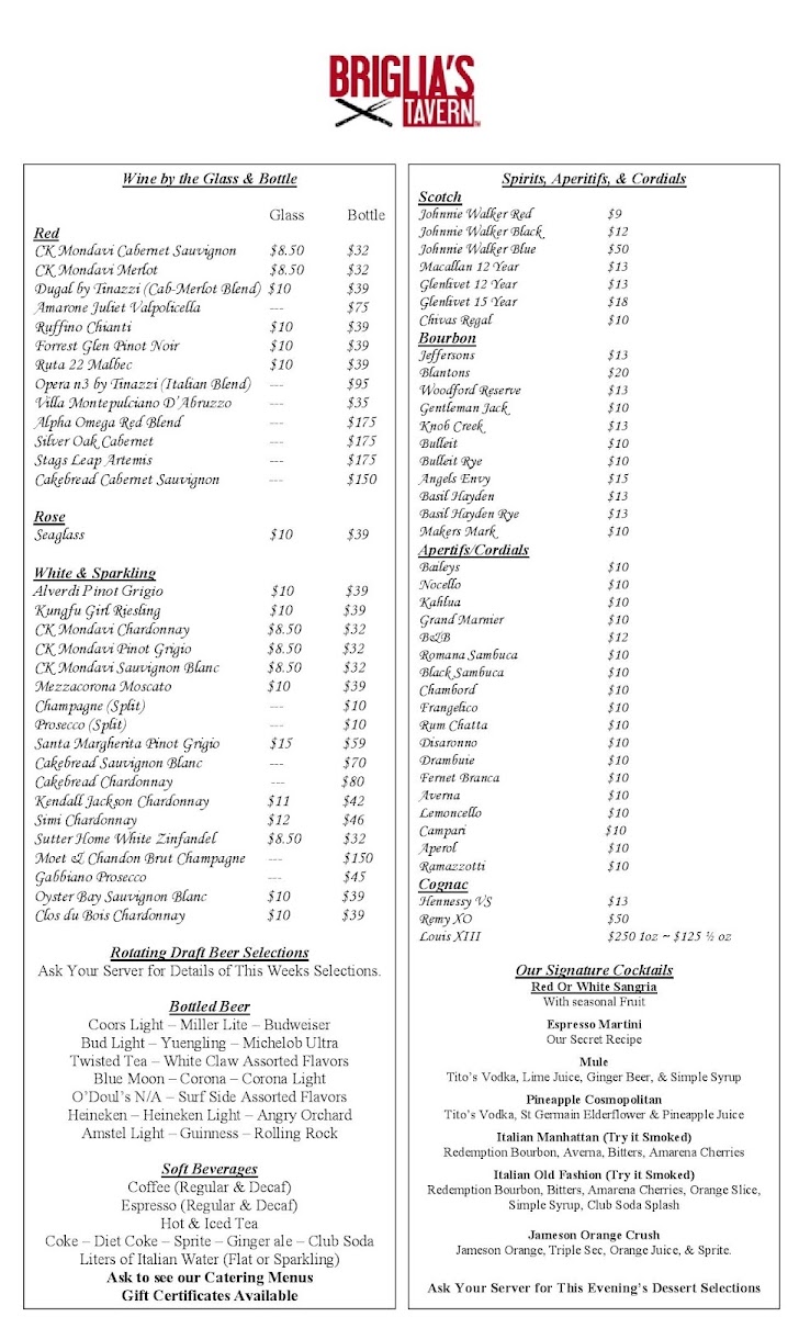 If you’re in the mood for a hearty meal in Berlin, NJ, Briglia's Tavern Menu is the perfect spot to satisfy your cravings. Known for its laid-back atmosphere and delicious comfort food, this local gem serves up everything from classic pub favorites to satisfying mains. Whether you're in the mood for a juicy burger, crispy wings, or a perfectly grilled steak, the menu here has something for every taste. For those who enjoy a good seafood dish, their fresh options never disappoint. The cozy setting makes it an ideal place to unwind with friends or family while enjoying a flavorful meal. From appetizers to dessert, each dish is crafted with care, ensuring a satisfying experience for all who visit. The variety and quality of the offerings make it a must-visit spot in town.